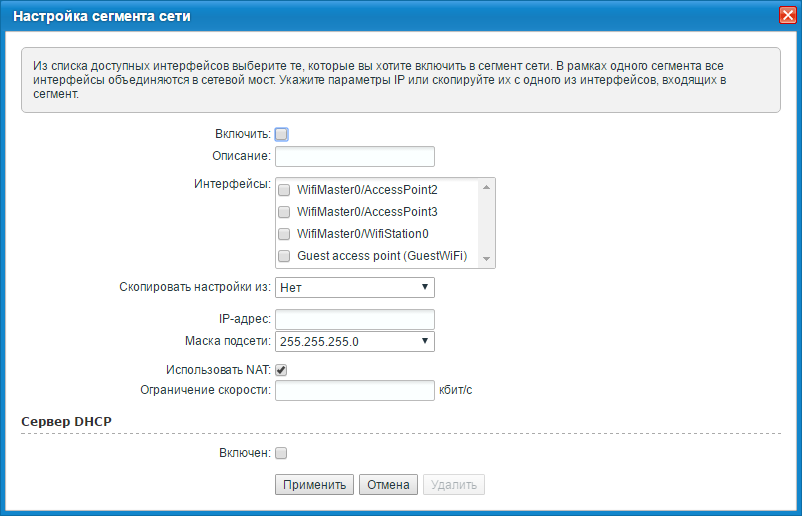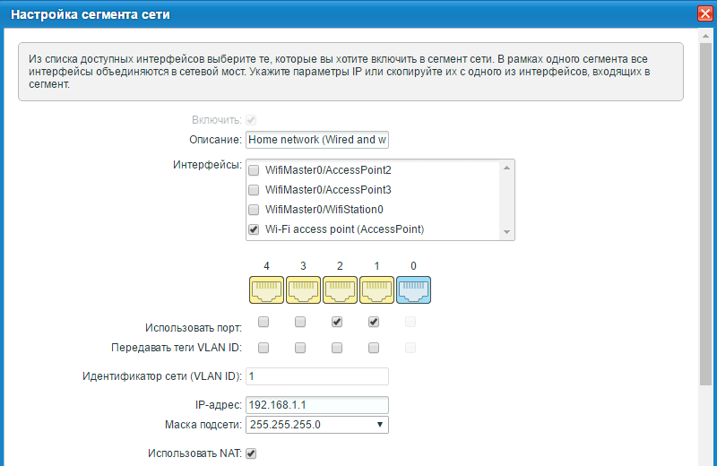 Сегмент представляет собой логический интерфейс, в который могут быть включены один или несколько доступных интерфейсов. В рамках одного сегмента все интерфейсы объединяются в сетевой мост.
