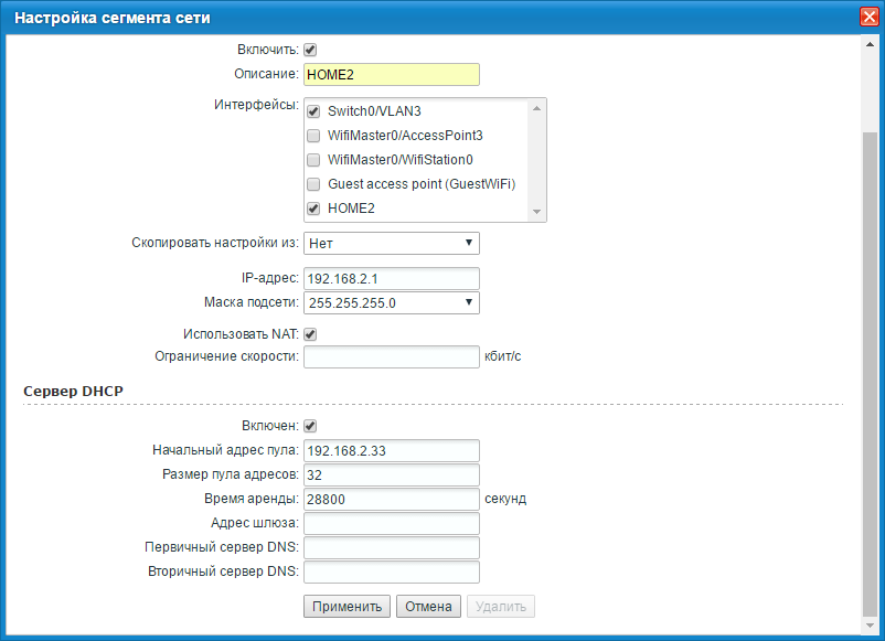 Предположим, нужно создать дополнительную подсеть, включающую в себя новую сеть Wi-Fi c именем HOME2 и порты 3, 4 встроенного коммутатора. В новой подсети должен быть свой DHCP-сервер и адресация, отличная от основной сети Home (192.168.2.x).