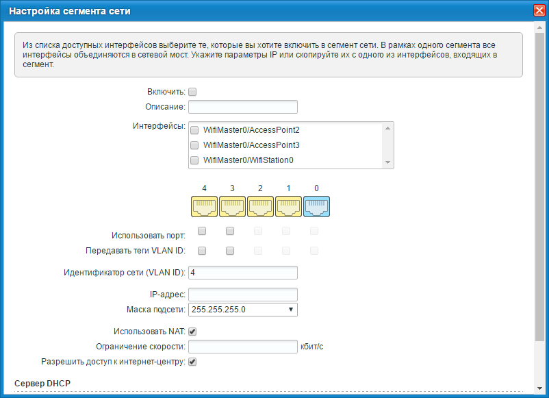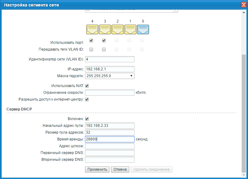Следующие параметры представлены в настройках сегмента сети — идентификатор сети (VLAN ID), IP-адрес и маска подсети для управления интернет-центром в локальной сети, сервер DHCP (размер пула адресов и его начальный адрес, время аренды IP-адресов, адрес шлюза, сервер DNS).