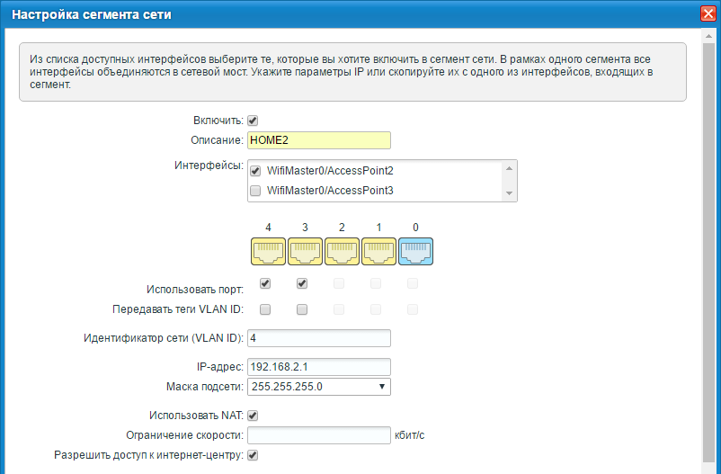С помощью сегментов сети можно создать дополнительную локальную сеть в интернет-центре.