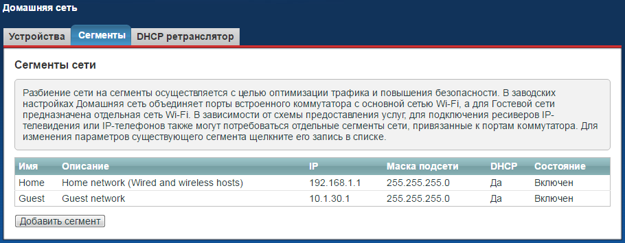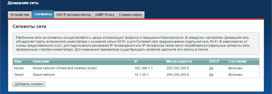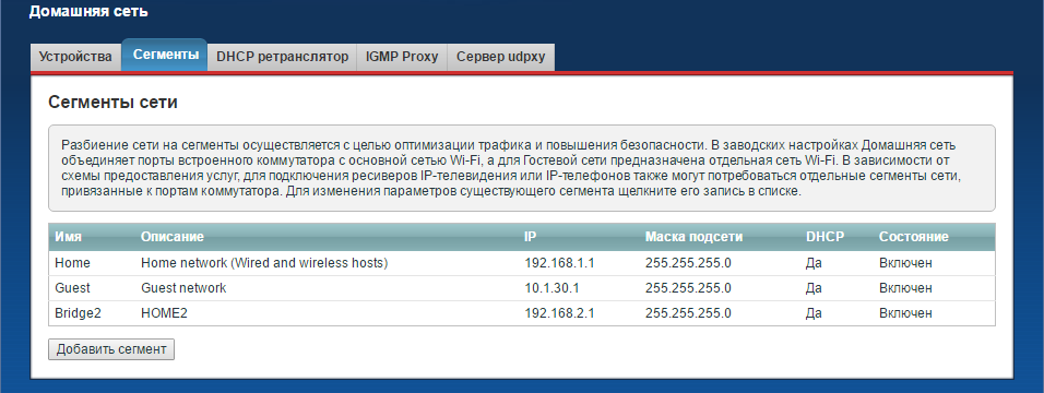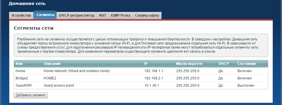 Подключитесь к веб-интерфейсу интернет-центра и зайдите в меню Домашняя сеть > Сегменты.