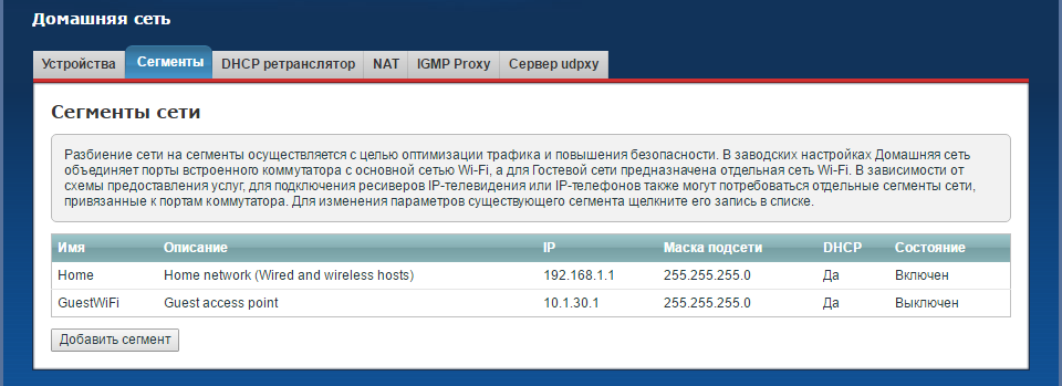Начиная с микропрограммы NDMS 2.05 в веб-интерфейсе интернет-центра доступен инструмент по настройке сегментов сети (меню Домашняя сеть > Сегменты).