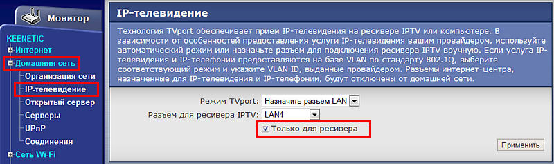 Подключитесь к веб-конфигуратору устройства. Зайдите в меню Домашняя сеть > IP-телевидение. В поле Режим TVport установите значение Назначить разъем LAN; в поле Разъем для ресивера IPTV укажите номер LAN-порта встроенного Ethernet-коммутатора (в нашем примере используется порт LAN4) и установите галочку в поле Только для ресивера.