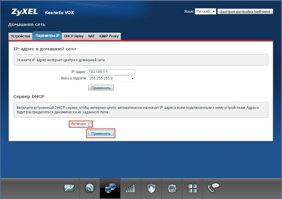 3. Отключите встроенный DHCP-сервер в меню Домашняя сеть > Параметры IP.