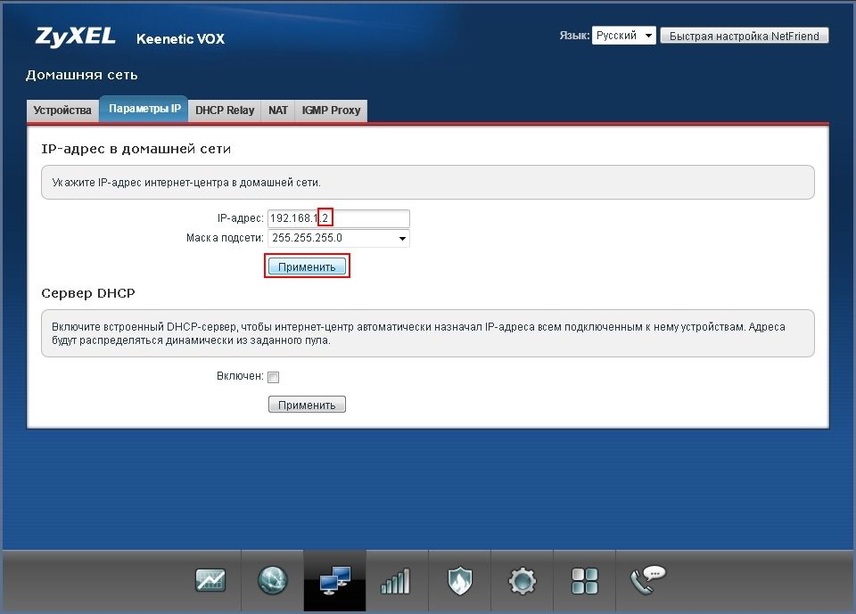 4. На той же вкладке измените IP-адрес интернет-центра Keenetic Vox на другой свободный адрес из вашей домашней подсети (например, если клиентам домашней сети назначаются IP-адреса из подсети 192.168.1.x, на Keenetic VOX установите IP-адрес 192.168.1.2).
