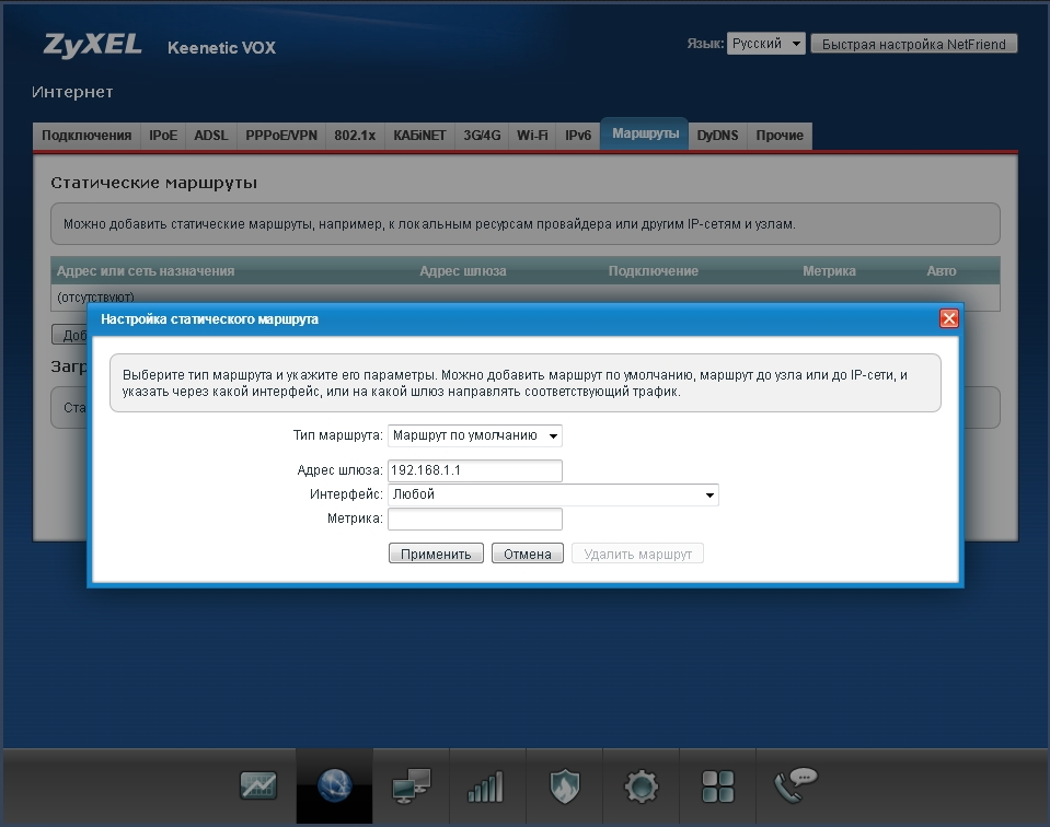 5. Зайдите по новому IP-адресу Keenetic VOX (в нашем примере по адресу 192.168.1.2) и в меню Интернет > Маршруты добавьте статический маршрут по умолчанию через IP-адрес вашего основного роутера, как это показано на рисунке.