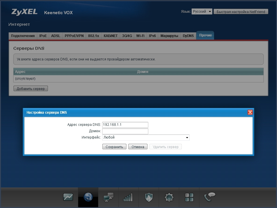 6. В меню Интернет > Прочие укажите IP-адрес сервера DNS. Обычно он совпадает с IP-адресом вашего основного роутера.