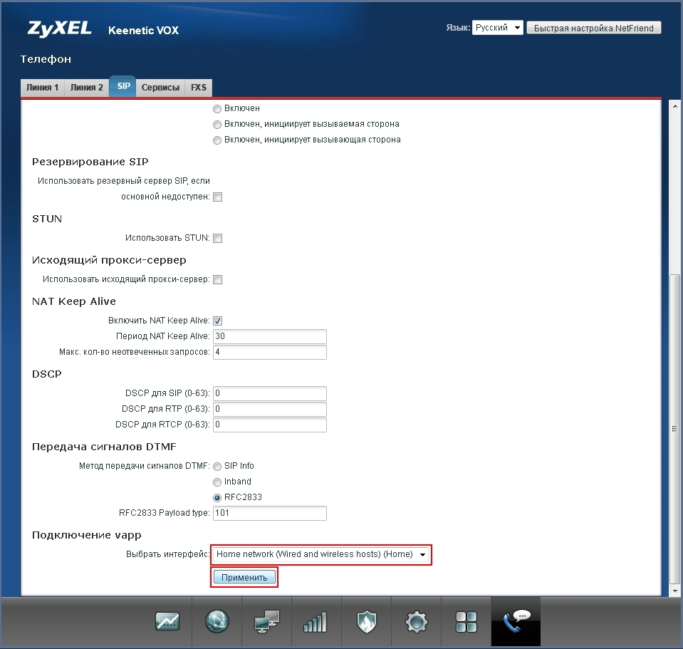 7. В меню Телефон > SIP установите привязку встроенного шлюза IP-телефонии к интерфейсу Home network.