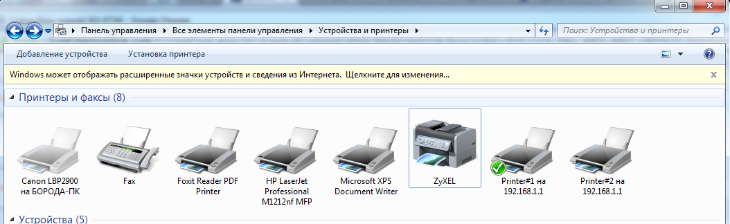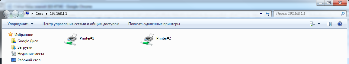 2. После указанных рекомендаций можно зайти на интернет-центр через Проводник по адресу \\192.168.1.1 и увидеть два подключенных принтера.