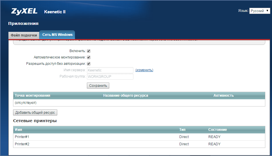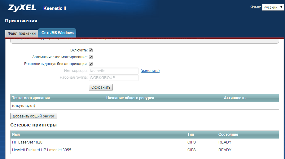 Для начала необходимо подключить оба принтера к USB-портам интернет-центра серии Keenetic и убедиться, что в Keenetic установлен компонент Сервер протокола доступа к файлами и принтерам в сетях Windows.