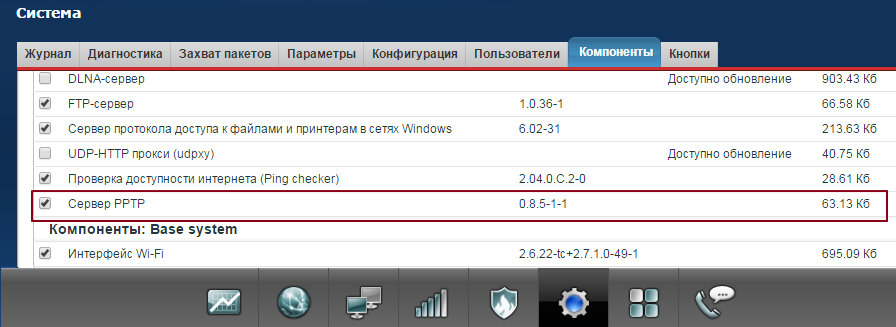 1. Первое, что требуется сделать - это убедиться, что на Keenetic установлен компонент Сервер PPTP. Дополнительную информацию о реализации PPTP-сервера на устройстве серии Keenetic с микропрограммой NDMS V2 можно найти в статье: «Реализация сервера PPTP»