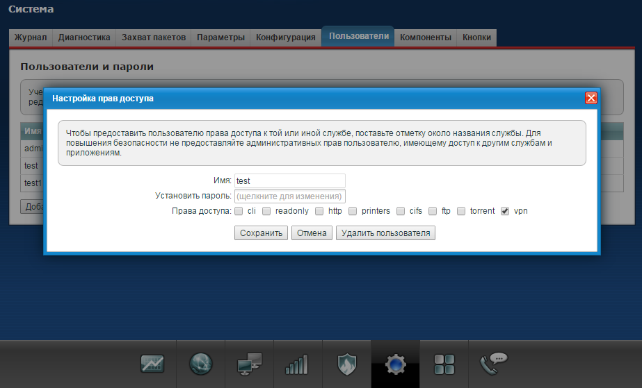 2. Далее создайте учетную запись пользователя test и предоставьте ему права доступа к VPN.