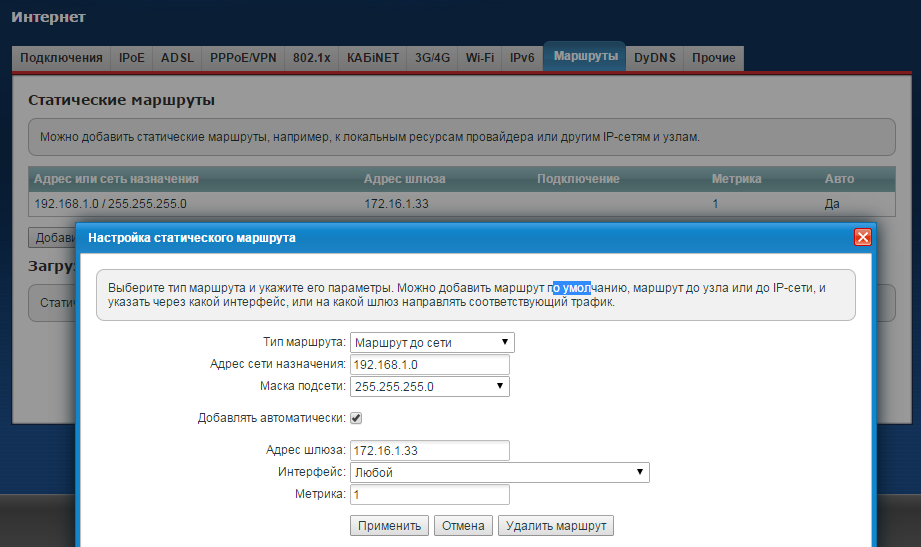 4. Далее нужно добавить статический маршрут до удаленного аппаратного шлюза, сообщая устройству, что удаленная сеть 192.168.1.0\24 находится за IP-адресом шлюза в VPN-туннеле. Так как в настройках VPN мы указали начальный IP-адрес пула для VPN-клиентов 172.16.1.33, наш шлюз как первый клиент будет иметь именно такой IP-адрес.