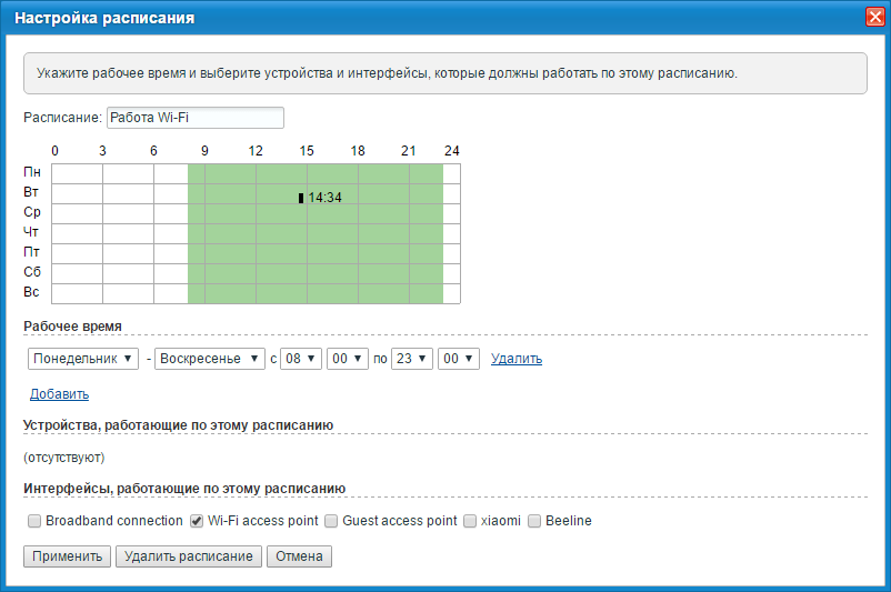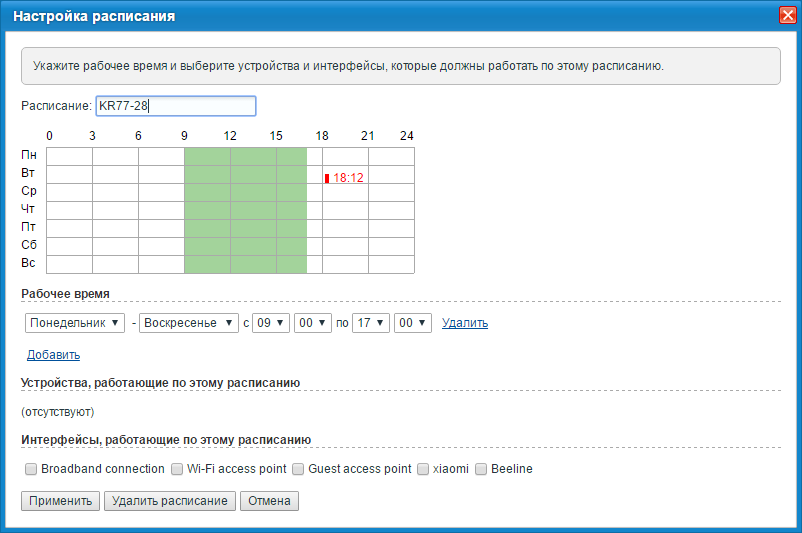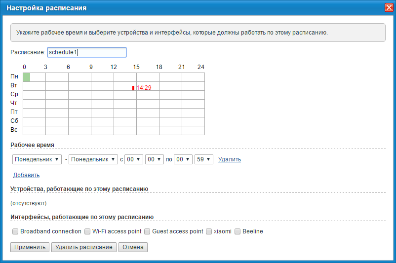Нажмите Добавить расписание и укажите Рабочее время, когда хост должен иметь доступ в Интернет.