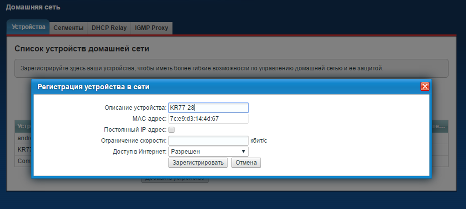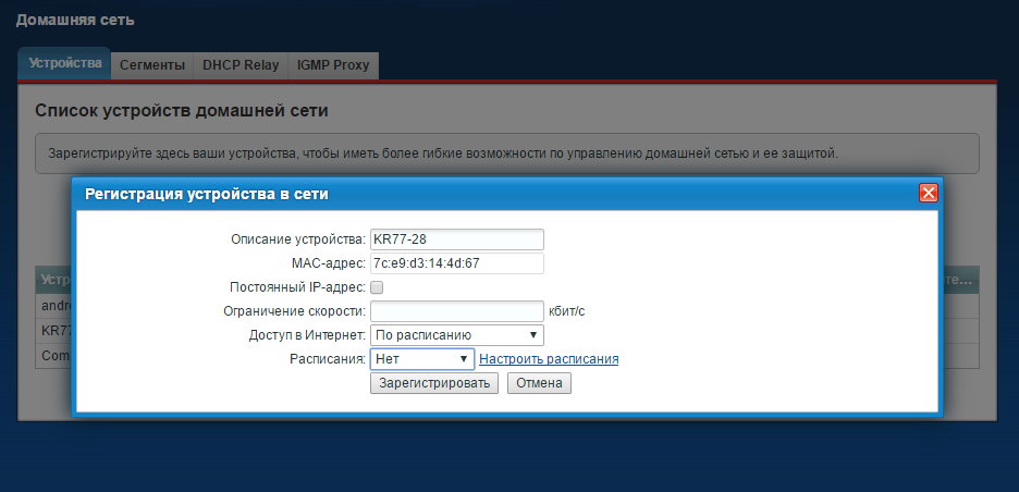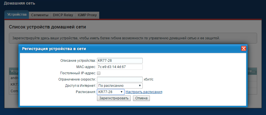 В окне Регистрация устройства в сети в поле Доступ в Интернет доступны три режима: Разрешен, Запрещен, По расписанию.