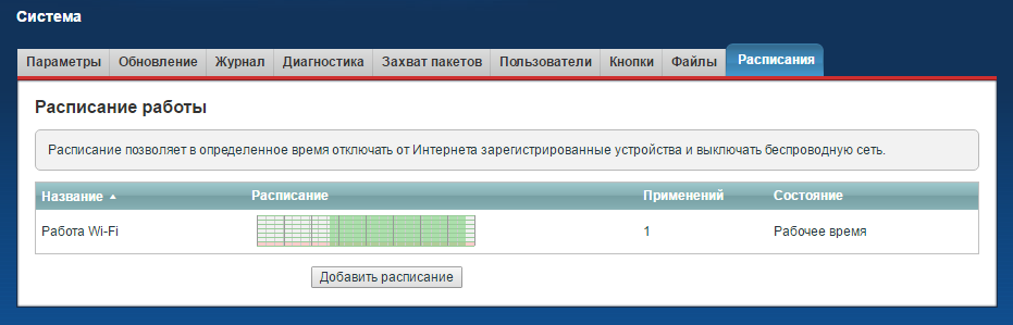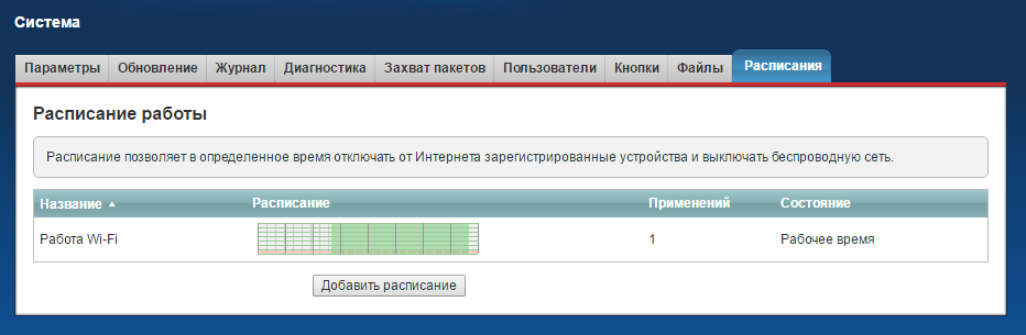 Пример использования функции Расписание можно найти в статье: «Родительский контроль: отключение Интернета по расписанию»