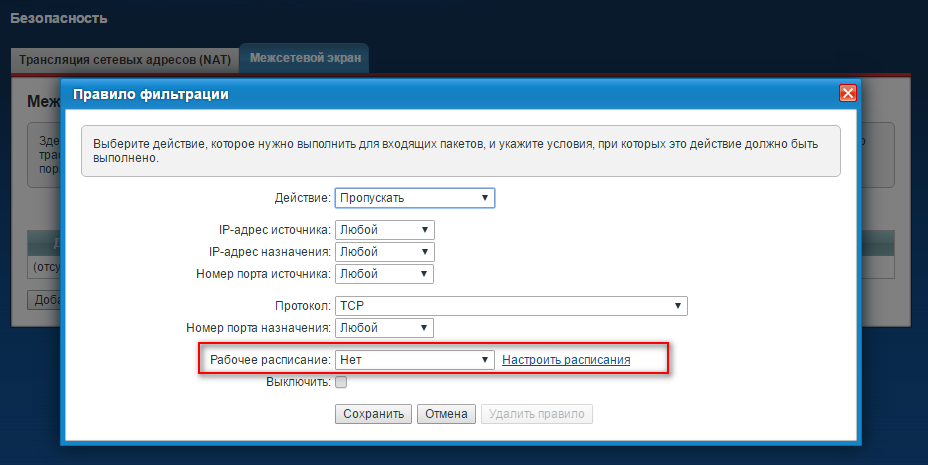При создании правила межсетевого экрана, или при его редактировании, доступно поле Рабочее расписание, в котором можно указать созданное ранее расписание.