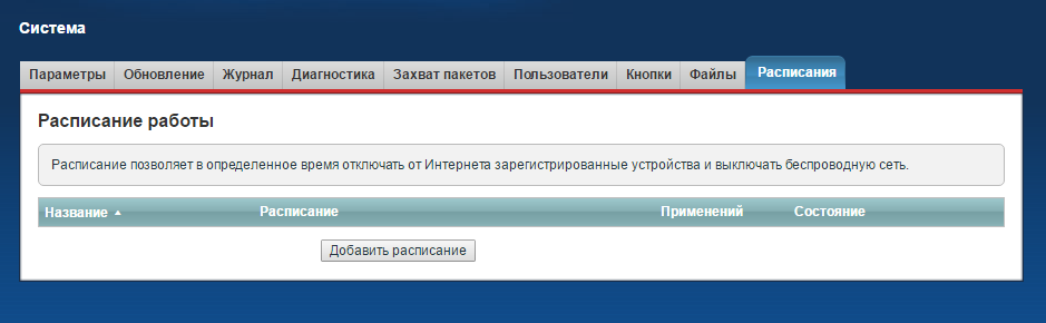 Чтобы добавить новое расписание, нажмите на ссылку Настроить расписание, после чего откроется страница Система > Расписания.