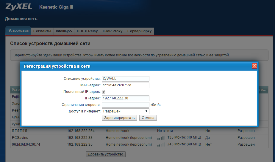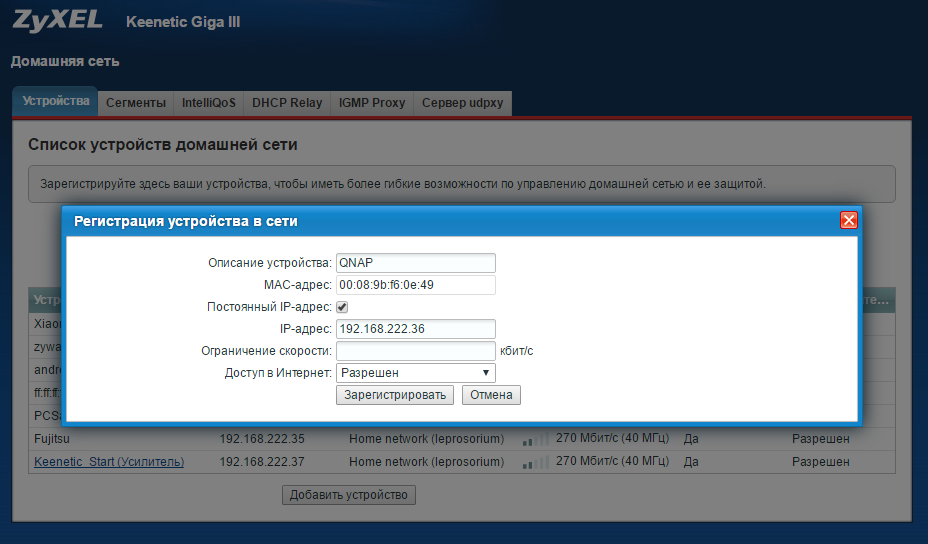1. Для начала в интернет-центре необходимо зарегистрировать устройства, на которые будет организован удаленный доступ. Сделать это можно в меню Домашняя сеть на вкладке Устройства. Щелкните по записи нужного устройства, поставьте галочку в поле Постоянный IP-адрес и нажмите кнопку Зарегистрировать.