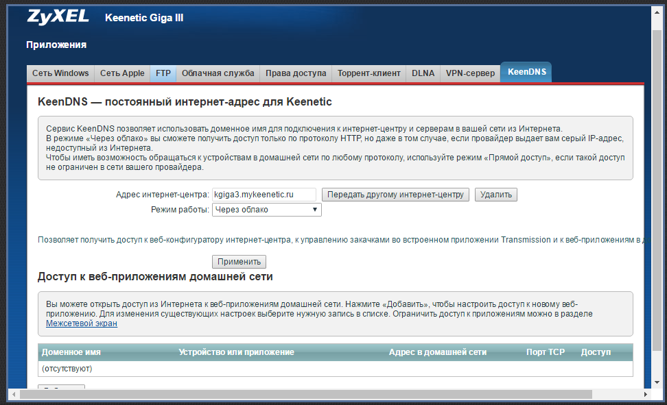 - В настройках интернет-центра выбрать свободное доменное имя KeenDNS и настроить работу сервиса через облако (подробная настройка представлена в статье «Использование сервиса удаленного доступа KeenDNS»;