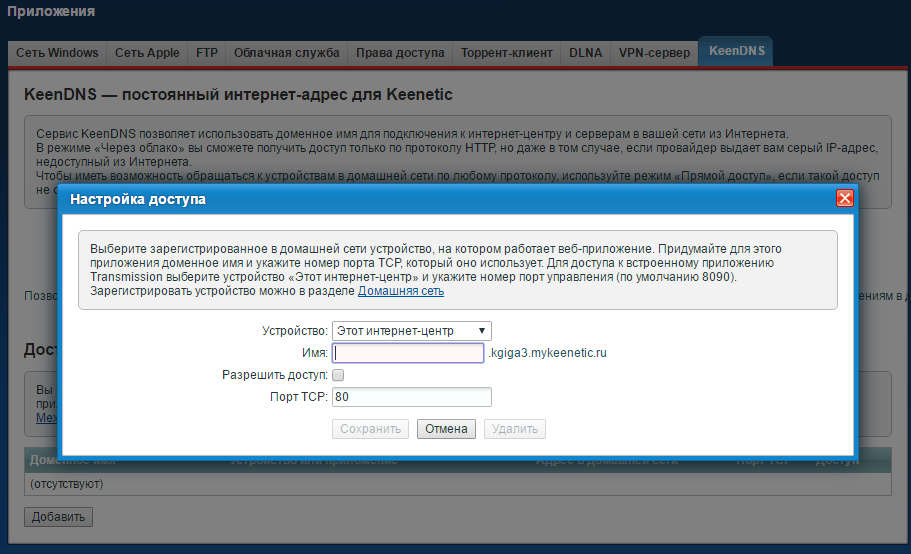 В нашем примере используется доменное имя интернет-центра 3-го уровня kgiga3.mykeenetic.ru и доменное имя 4-го уровня torrent для приложения. Таким образом, приложение Transmission будет доступно по доменному имени torrent.kgiga3.mykeenetic.ru