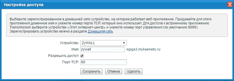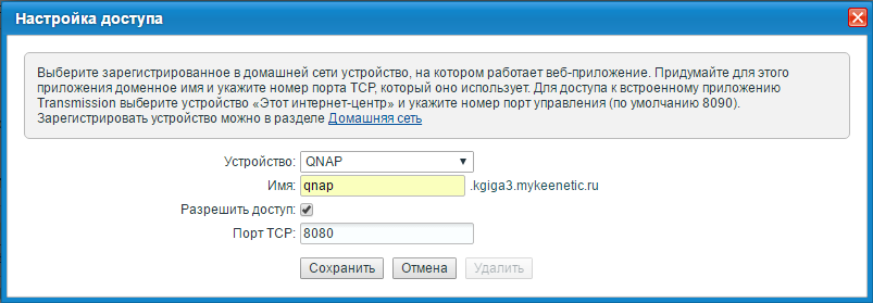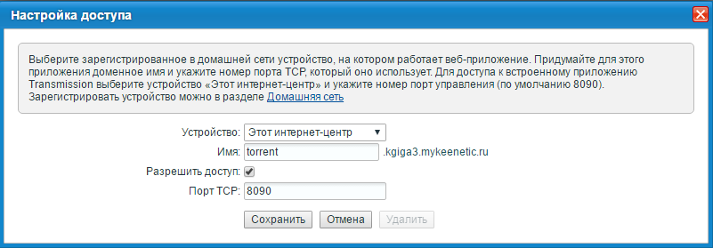Устройство: Выберите зарегистрированное в домашней сети устройство, на котором работает веб-приложение. Можно выбрать интернет-центр, для доступа к встроенным сервисам (например, торрент-клиенту Transmission) или любое другое устройство, зарегистрированное в домашней сети.