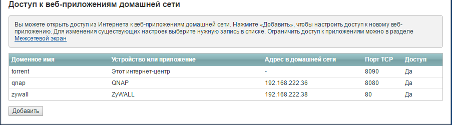 3. В разделе Доступ к веб-приложениям домашней сети нажмите кнопку Добавить.
