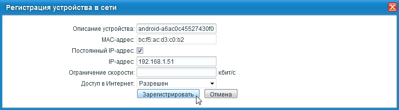 В появившемся окне Регистрация устройства в сети поставьте галочку в поле Постоянный IP-адрес и нажмите кнопку Зарегистрировать.