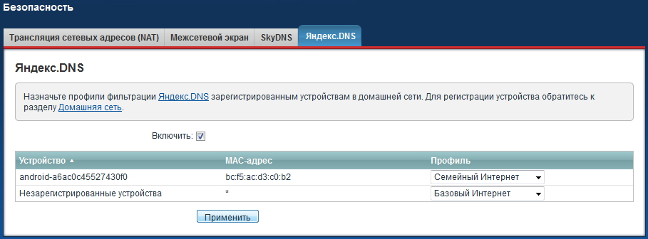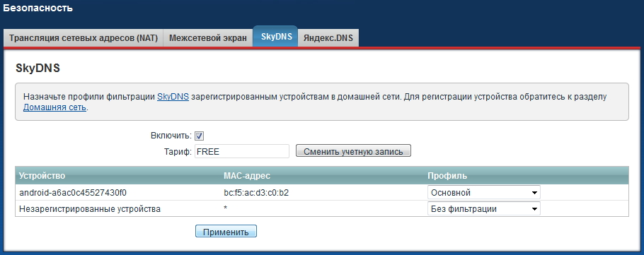 При использовании родительского контроля не забывайте использовать один из механизмов фильтрации посещаемых интернет-сайтов, доступных в интернет-центре Keenetic — Яндекс.DNS или SkyDNS.