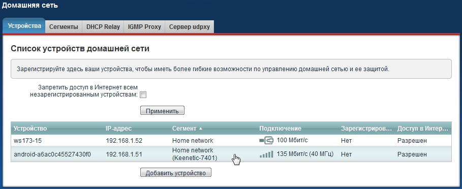 В меню Домашняя сеть на вкладке Устройства можно посмотреть список всех подключенных устройств домашней сети (беспроводных и подключенных по кабелю). В нашем примере к интернет-центру по Wi-Fi подключен смартфон.