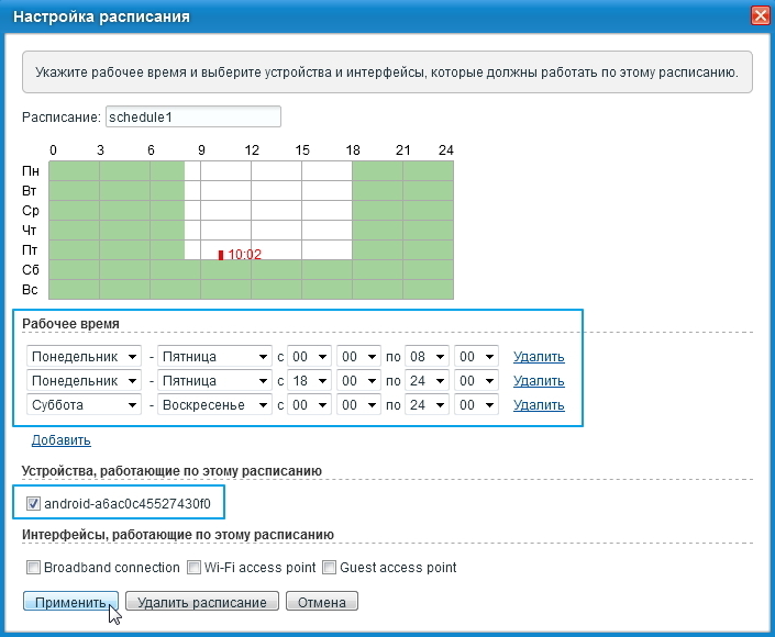 При необходимости в работе расписания можно указать интерфейсы, для которых оно будет работать. Обращаем ваше внимание, что при выключении интерфейса Broadband connection Интернет будет недоступен для всех устройств домашней сети (при подключении к провайдеру по выделенному кабелю), а когда выключен интерфейс точки доступа Wi-Fi access point, её имя не будет доступно в беспроводной сети и индикатор Wi-Fi на устройстве будет выключен.