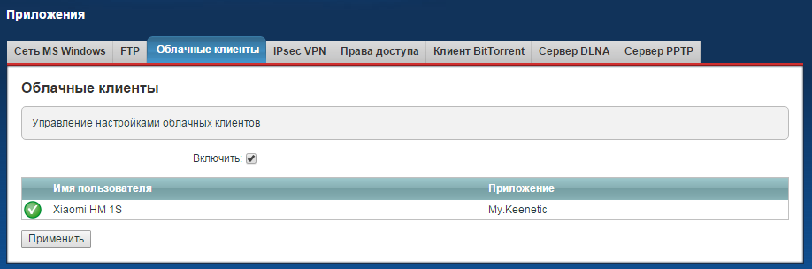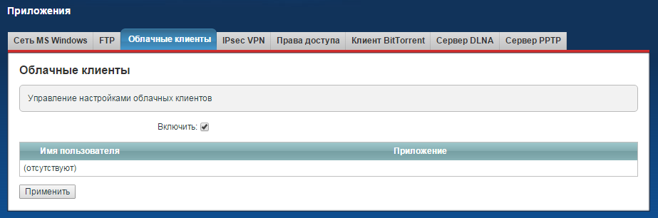2. Далее в меню Приложения > Облачные клиенты установите галочку в поле Включить и нажмите кнопку Применить.