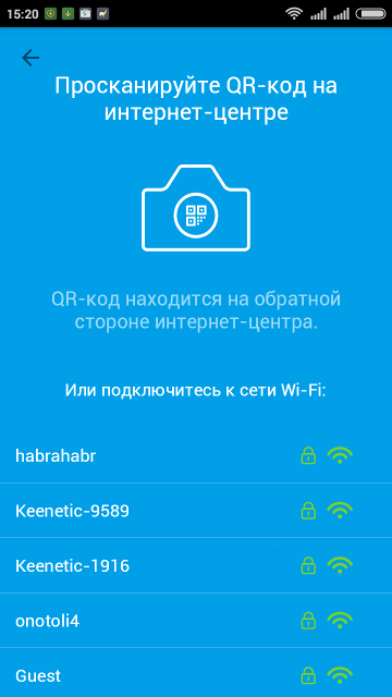 4. После запуска, приложение попросит подключиться к Wi-Fi-сети вашего интернет-центра (в случае, если вы уже предварительно настраивали устройство и выполняли настройку сети Wi-Fi), либо просканировать QR-код на обратной стороне интернет-центра (в случае, если интернет-центр находится на заводских установках, т.е. с настройками по умолчанию).