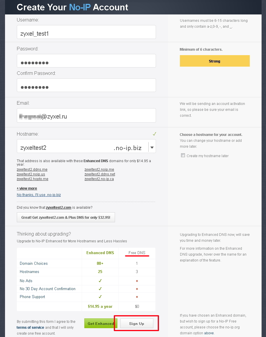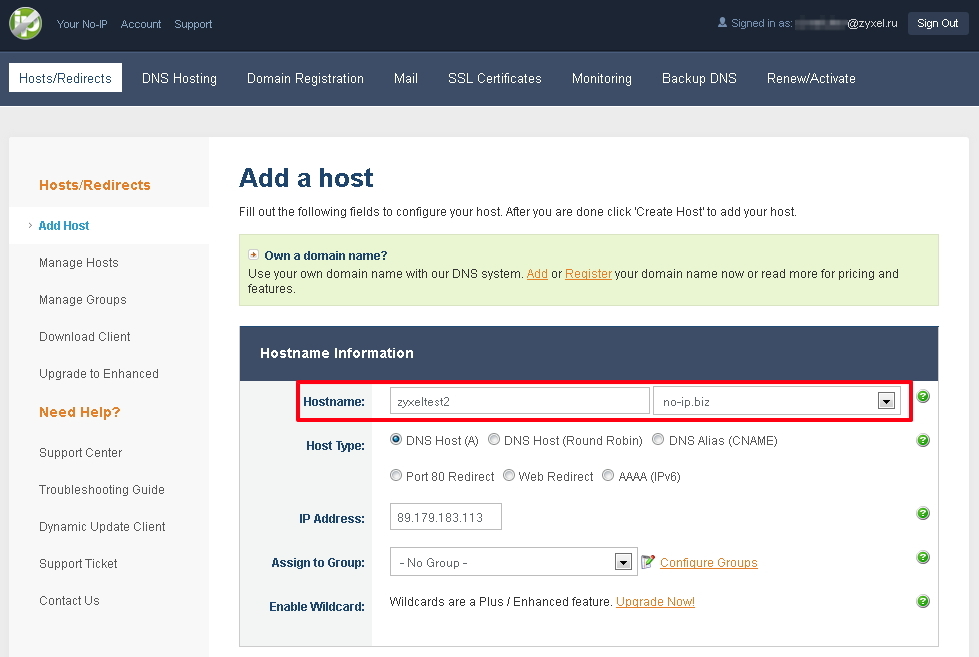 В поле Hostname укажите ваше доменное имя и один из вариантов домена. В нашем примере динамическому IP-адресу будет соответствовать доменное имя zyxeltest2.no-ip.biz.