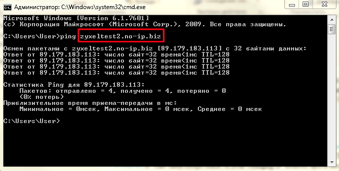 Вы можете проверить активность доменного имени командой: ping имя_хоста (в нашем примере это команда ping zyxeltest2.no-ip.biz).