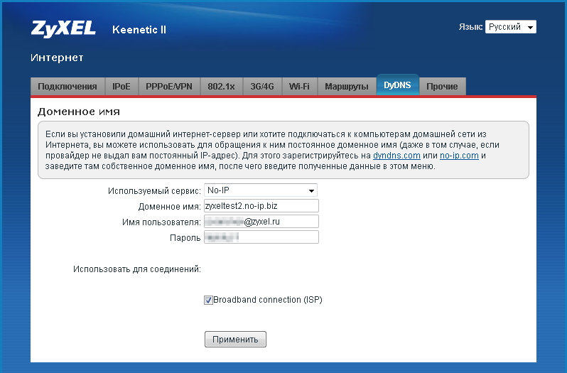 В поле Используемый сервис выберите No-IP из выпадающего списка.