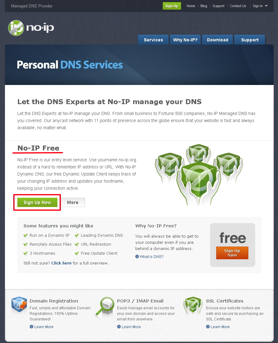 Вам будет предложено несколько вариантов предоставления услуг. В нашем примере выберем бесплатный сервис No-IP Free. Для регистрации новой учетной записи нажмите кнопку Sign Up Now.