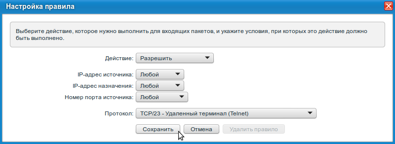 2. Для удаленного доступа по протоколу telnet (к интерфейсу командной строки CLI интернет-центра) правило межсетевого экрана будет выглядеть так: