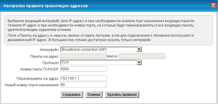 3. Если вам требуется перевести удаленное управление устройством из Интернета на другой порт (например, ваш провайдер блокирует стандартный порт 80 и вы хотите использовать для доступа к веб-конфигуратору порт 8080), в меню Безопасность > Трансляция сетевых адресов в правиле NAT в поле Номер порта нужно указать требуемый внешний номер порта (например, 8080):