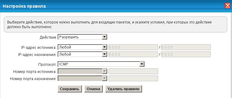 Если вы хотите разрешить удаленный доступ к веб-интерфейсу интернет-центра только с определенного IP-адреса или только для определенной подсети, в этом случае правило межсетевого экрана будет выглядеть следующим образом: