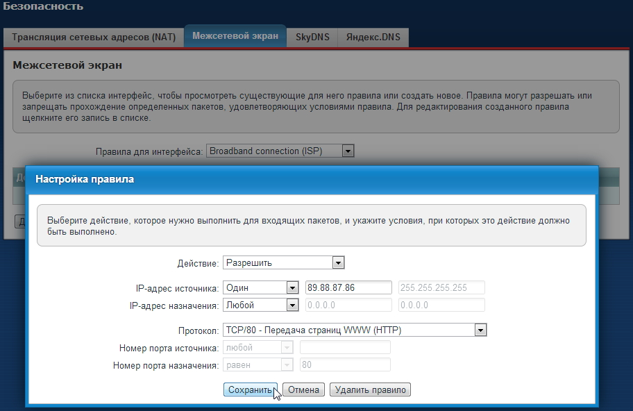 В поле Действие установите значение Разрешить, в поле IP-адрес источника установите значение Один (для доступа из Интернета только с одного указанного IP-адреса) или Подсеть (для доступа с какой-то определенной подсети IP-адресов) и укажите соответственно IP-адрес или подсеть (в нашем примере мы предполагаем, что доступ к веб-интерфейсу интернет-центра будет возможен только с IP-адреса 89.88.87.86). В поле Протокол можно указать конкретный стандартный протокол (в нашем примере это порт TCP/80), через который будет разрешен доступ. В поле Номер порта назначения вы также можете самостоятельно указать нужный номер порта, если он нестандартный.