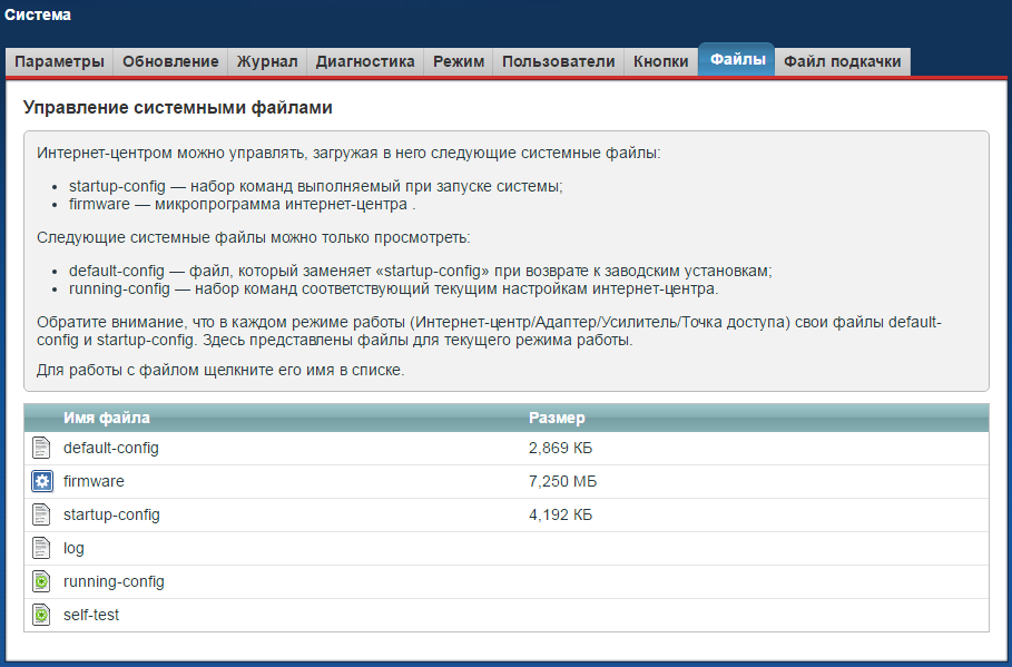 Обращаем ваше внимание, что системные файлы startup-config и firmware вы можете загружать (записывать) и сохранять (просматривать). А системные файлы default-config, log, running-config и self-test вы можете только просмотреть и сохранить на компьютере, загрузить их в интернет-центр нельзя.