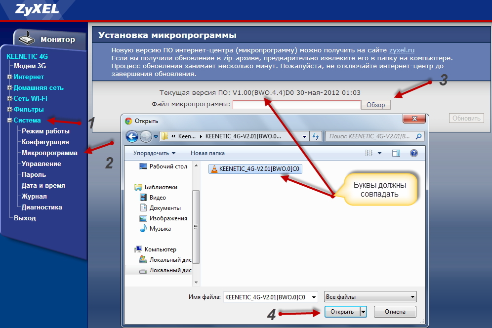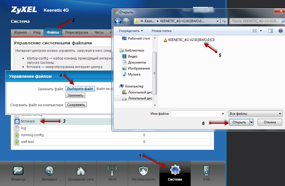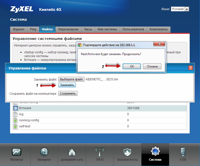 Зайдите в меню Система > Файлы, нажмите на firmware и затем в появившемся окне нажмите кнопку Выберите файл. Далее укажите путь к нужному файлу микропрограммы и нажмите Открыть.