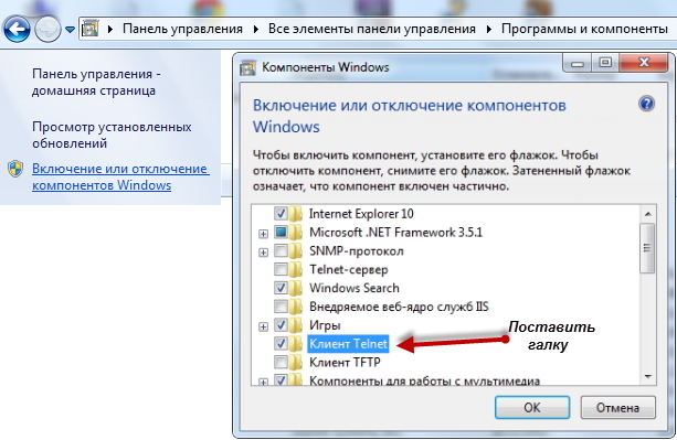 Если команда telnet не заработала (по умолчанию в Windows 7/8 она отключена), то необходимо включить ее. Для этого зайдите в меню Пуск > Панель управления > Программы и компоненты. Далее нажмите на Включение или отключение компонентов Windows. Появится окно, в котором нужно поставить галочку напротив компонента Клиент Telnet и нажать ОК: