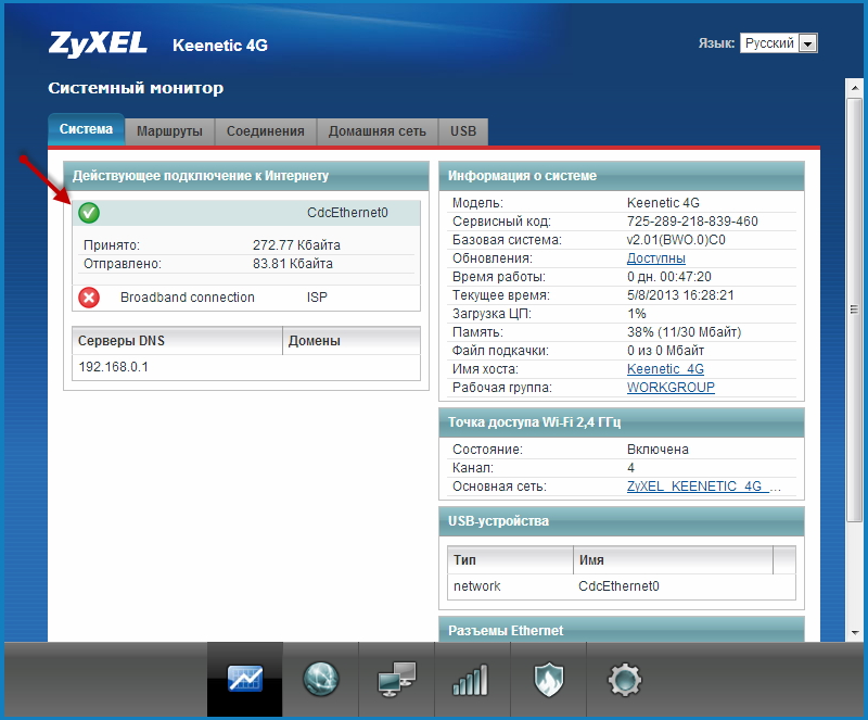 Затем снова подключитесь к веб-конфигуратору маршрутизатора и перейдите в Системный монитор. В разделе Действующее подключение к Интернету вы увидите соединение (CdcEthernet0). На этом настройка подключения завершена.
