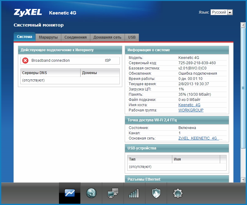 Для начала убедитесь, что в интернет-центре установлена микропрограмма версии NDMS не ниже v2.01. При необходимости обновите версию ПО интернет-центра.