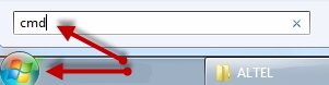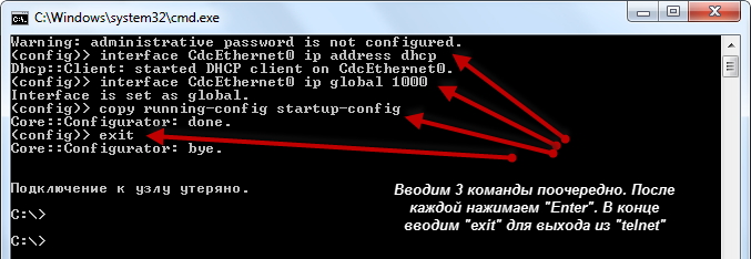 В командной строке Windows установите telnet-подключение с устройством: