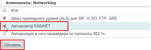 Для начала следует установить компонент Авторизатор KAБiNET. Отметьте его галочкой и нажмите кнопку Обновить.