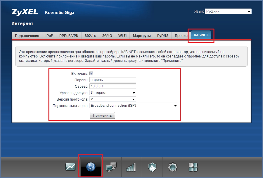 2. Включите авторизацию КАБiNET в интернет-центре Keenetic. Подключитесь к веб-конфигуратору устройства, зайдите в меню Интернет > КАБiNET, установите галочку в поле Включить, в поле Пароль укажите пароль, предоставленный провайдером, в поле Сервер укажите IP-адрес сервера. Настройки в полях Уровень доступа и Версия протокола оставьте неизменными. В поле Подключаться через можно указать интерфейс, через который будет осуществляться авторизация к сети провайдера КАБiNET. Нажмите кнопку Применить для сохранения параметров.