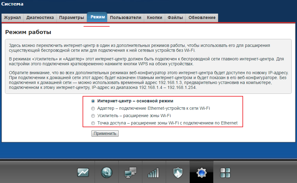В настройках интернет-центра доступны 4 режима работы устройства — один основной и три дополнительных:
